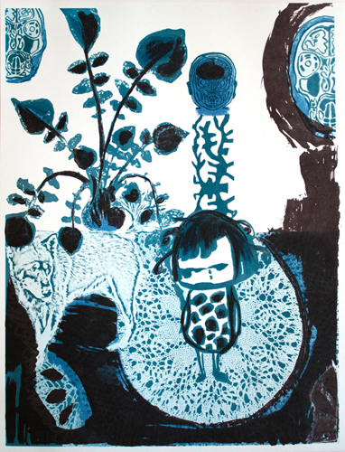 Die Druckgrafiken kombinieren verschiedene Techniken des Hochdruckes: farbige Holz- und Linolschnitte, Materialdrucke und Zeichnungen. Die Arbeiten sind meist Unikate oder kleine Auflagen. Sie entstehen vorrangig im Handdruck auf Japanpapier.